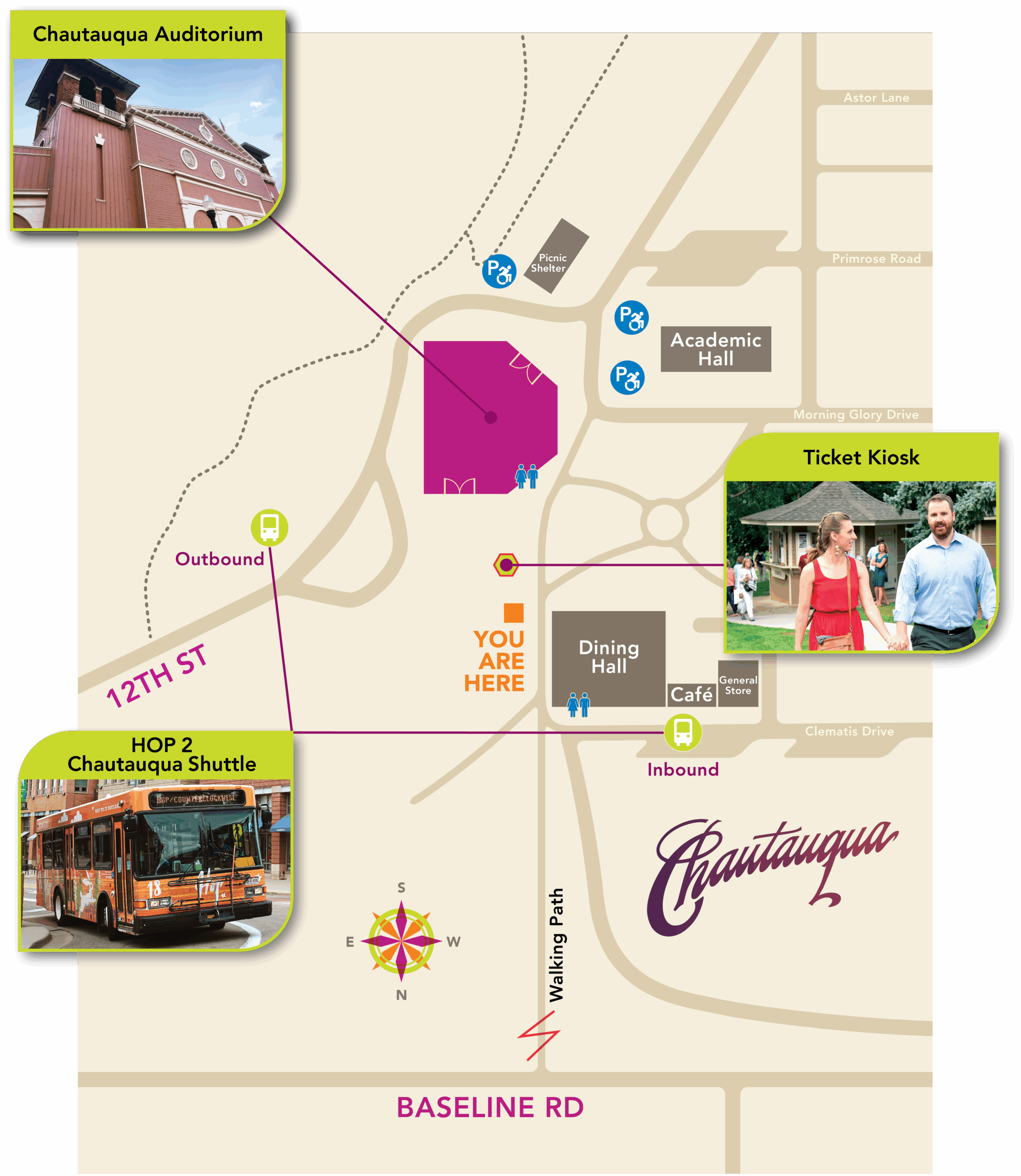ADA-accessible parking is available at Chautauqua and at New Vista High School. Find details on our Frequently Asked Questions page.